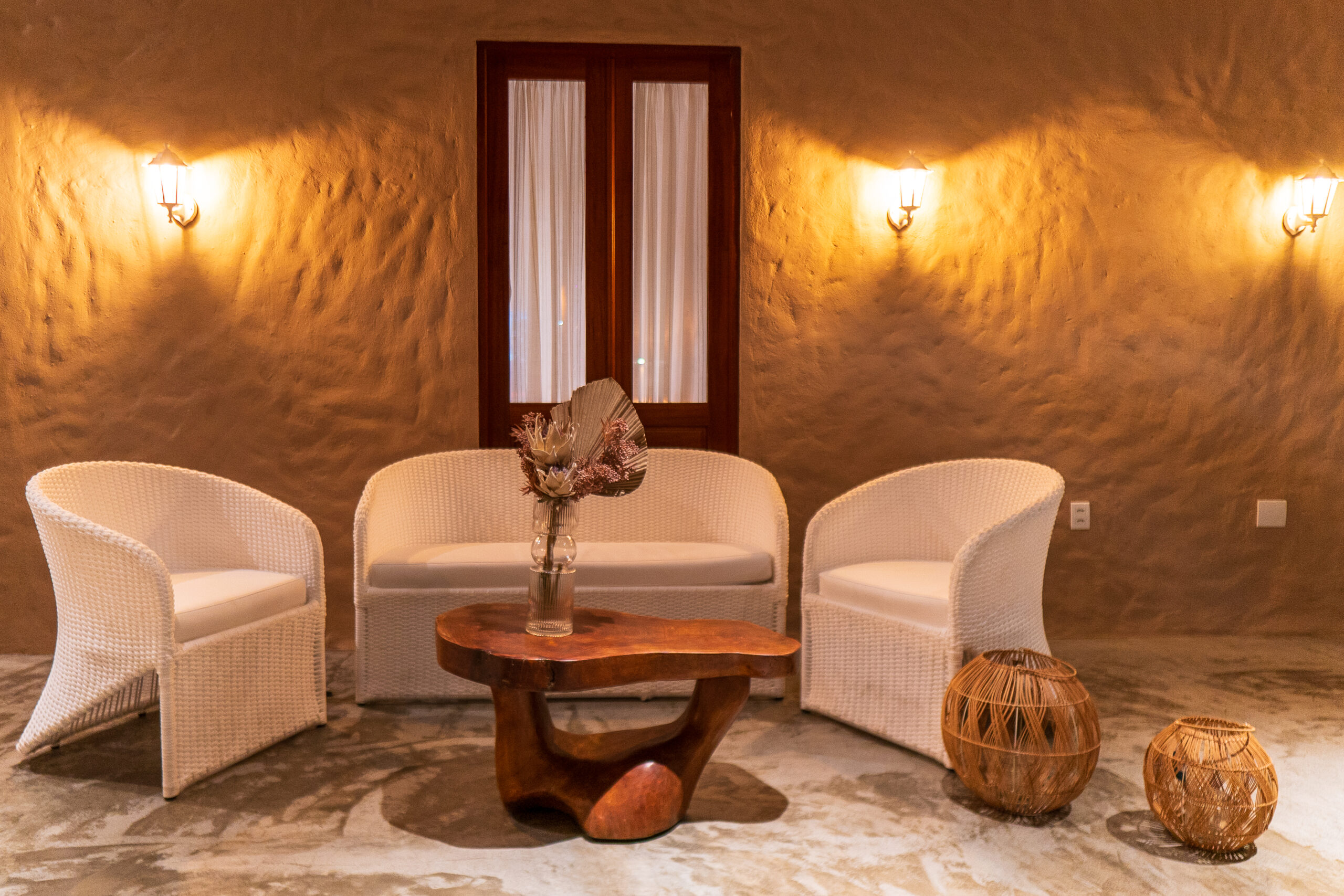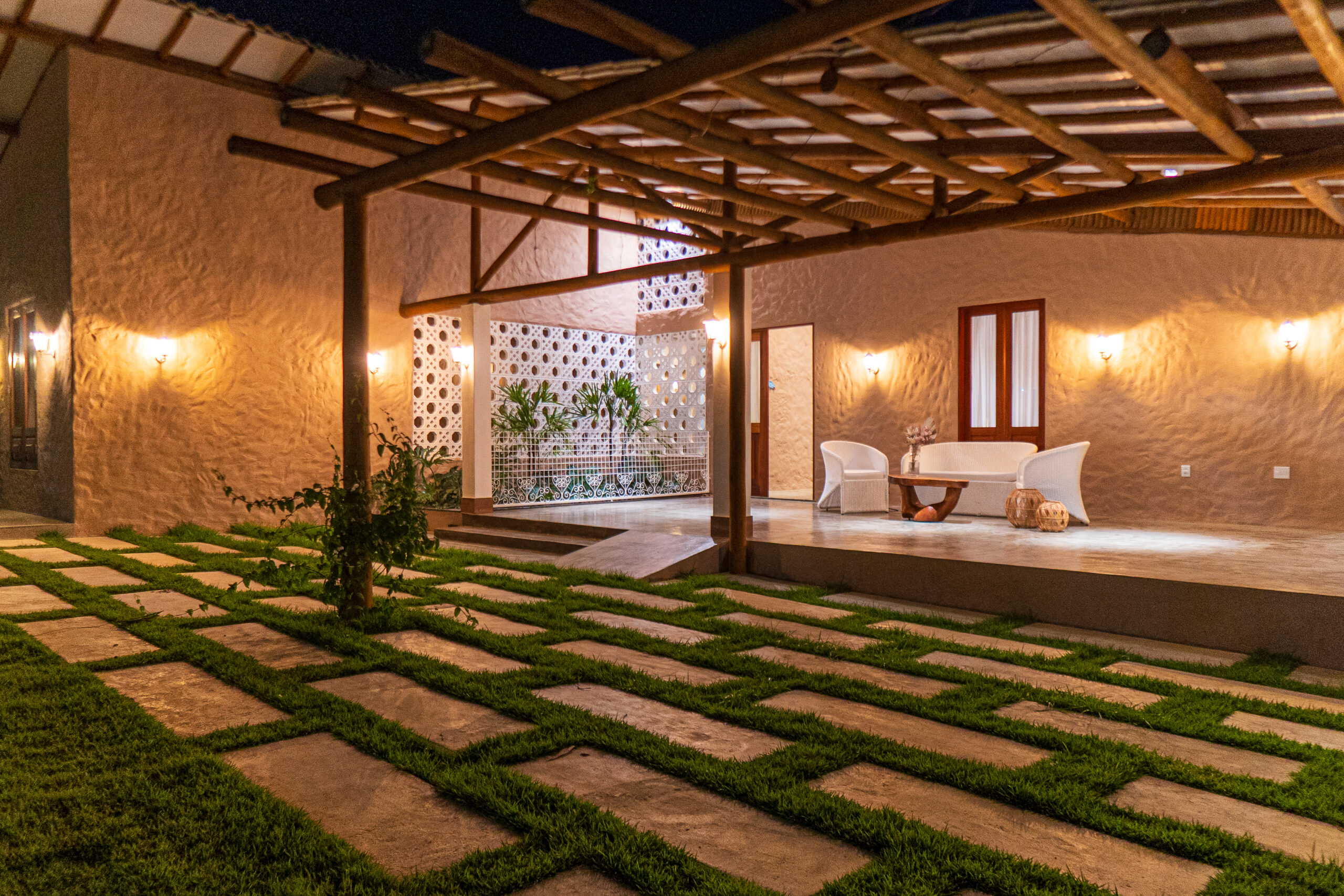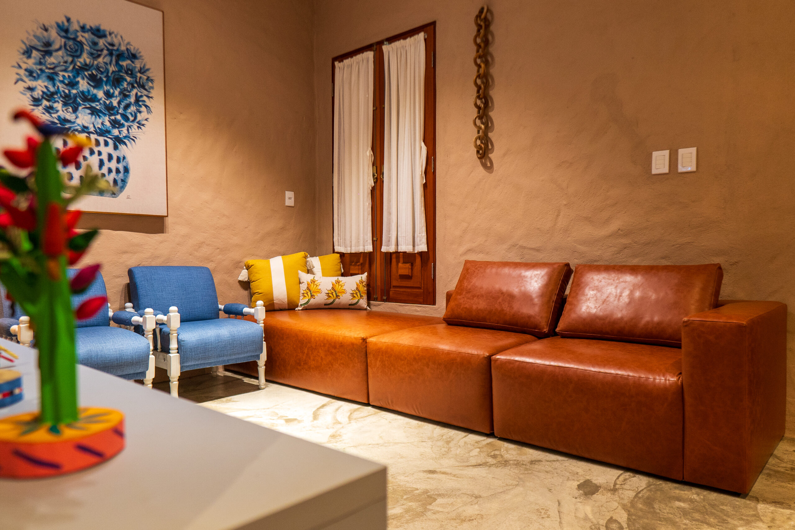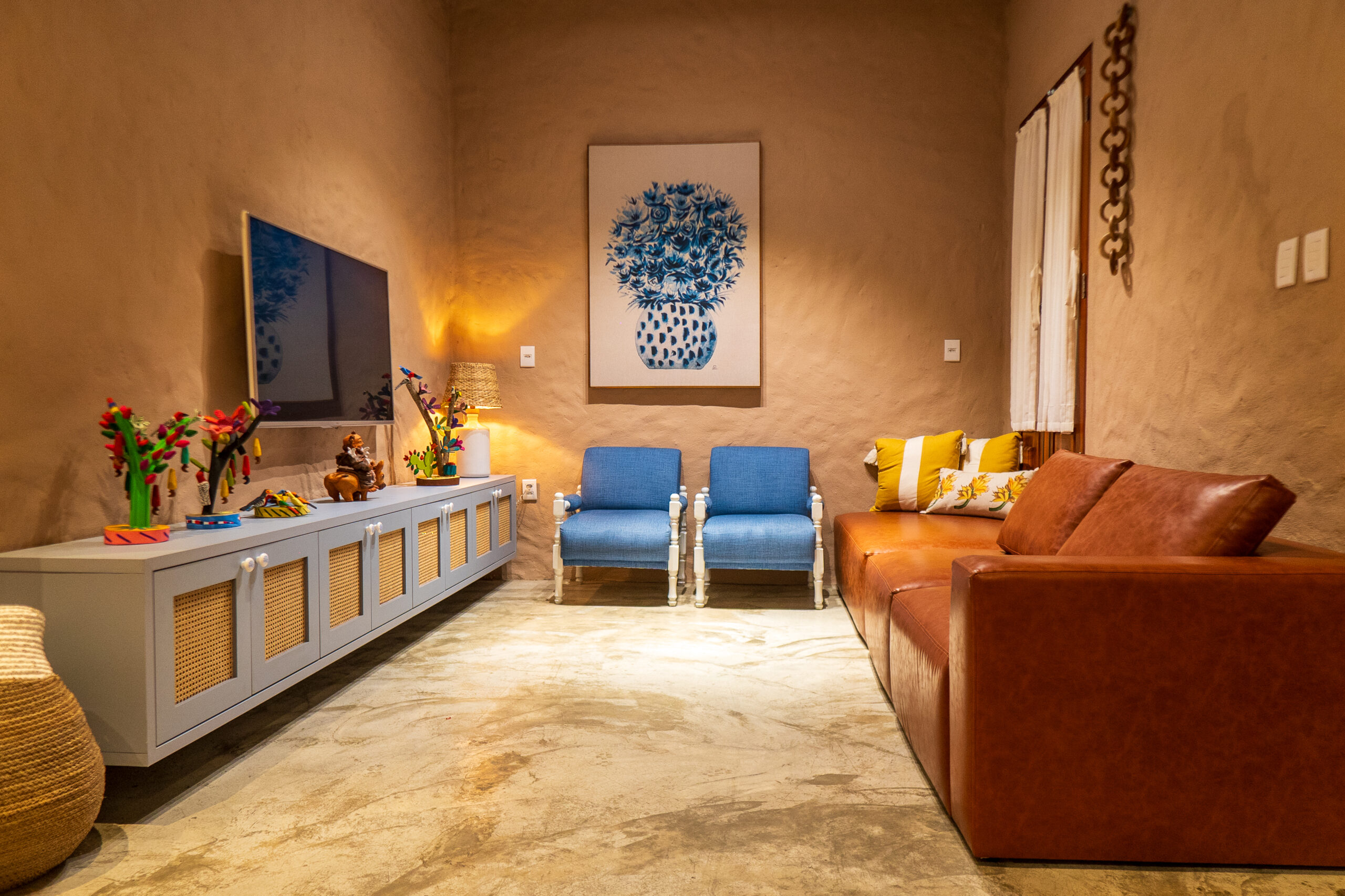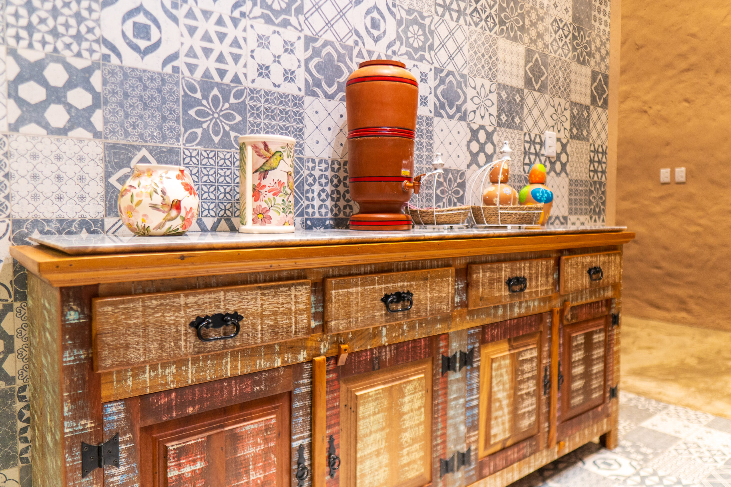 As paredes rebocadas no estilo baiano (relevo leve e aparência artesanal) trazem um toque regional autêntico e aconchegante. No piso, o destaque vai para os azulejos tipo português, que apresentam desenhos clássicos e coloridos, criando uma atmosfera vibrante e charmosa.