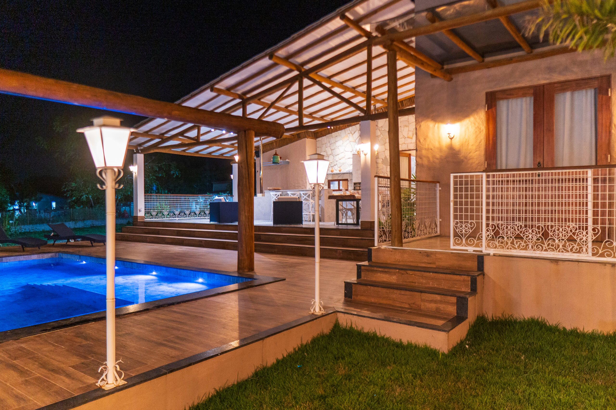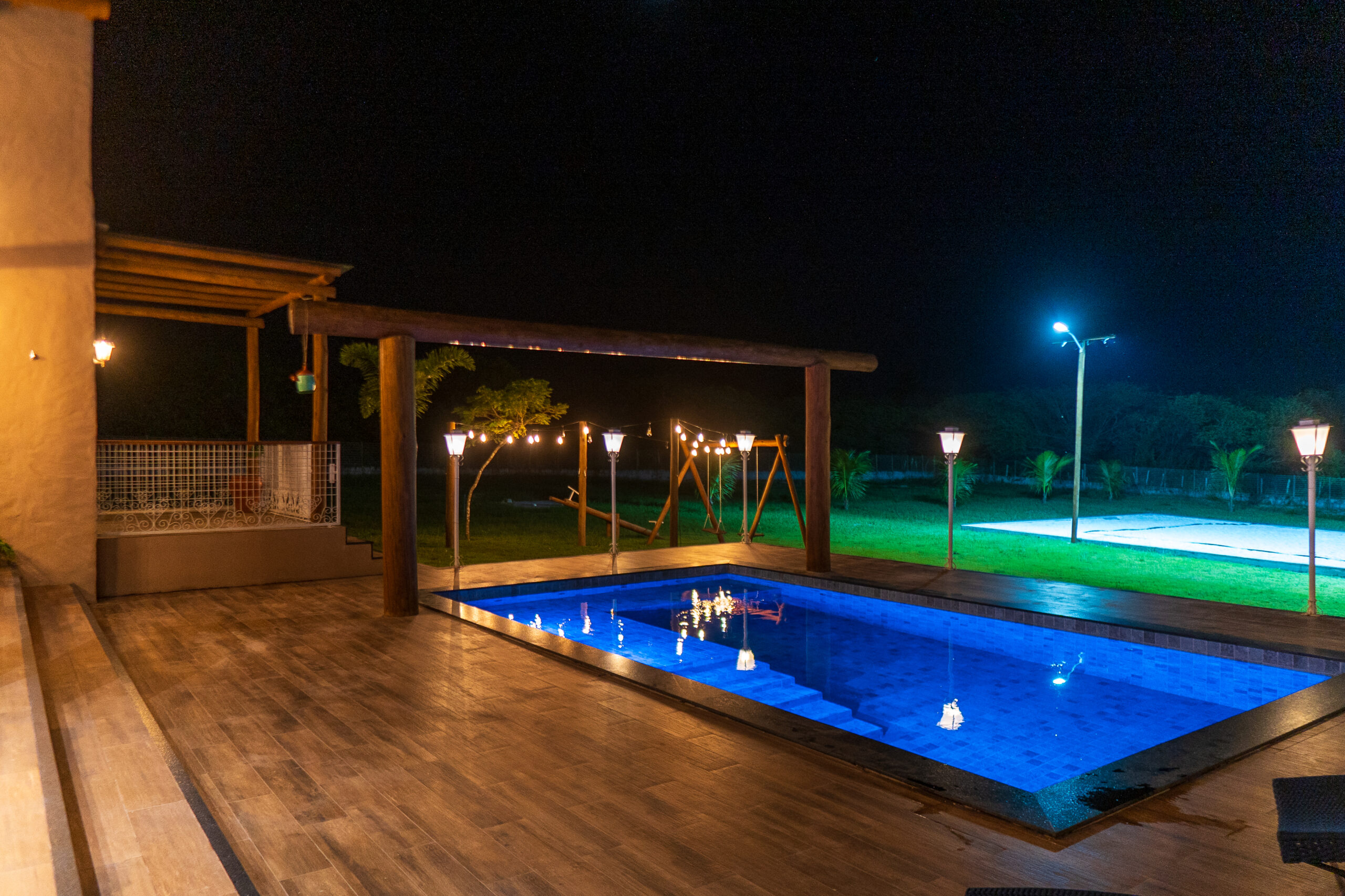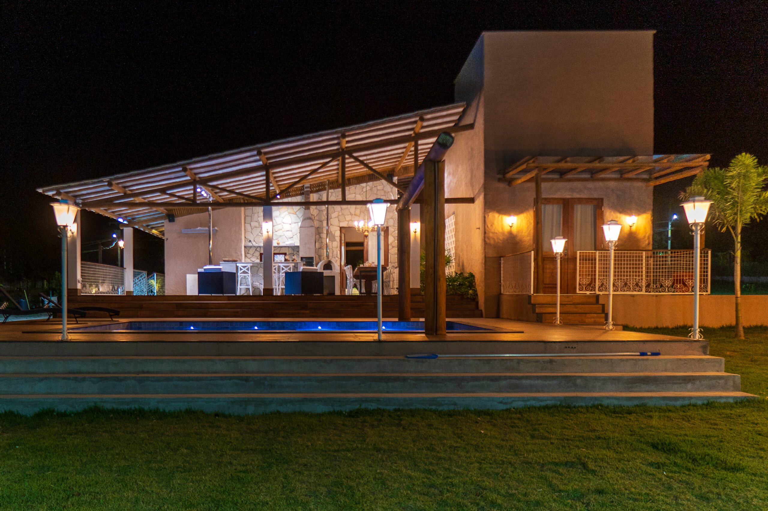 A residência é envolvida por um generoso espaço externo, onde se destaca uma piscina ampla, com revestimento em pastilhas em tons de azul e borda em pedra natural, harmonizando com a vegetação do entorno. O deck ao redor é feito em madeira tratada, criando um espaço perfeito para relaxamento e convivência ao ar livre.