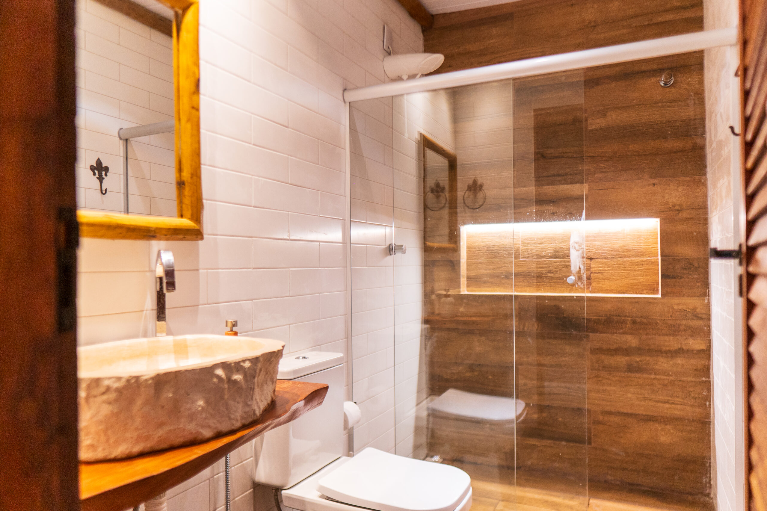 Anexo à área da piscina, o espaço gourmet é o coração social da casa. Conta com fogão a lenha tradicional, ideal para preparar pratos típicos e reunir amigos e familiares. O charme do ambiente é reforçado pelo revestimento em pedra natural em uma das paredes, conferindo um aspecto rústico e sofisticado.