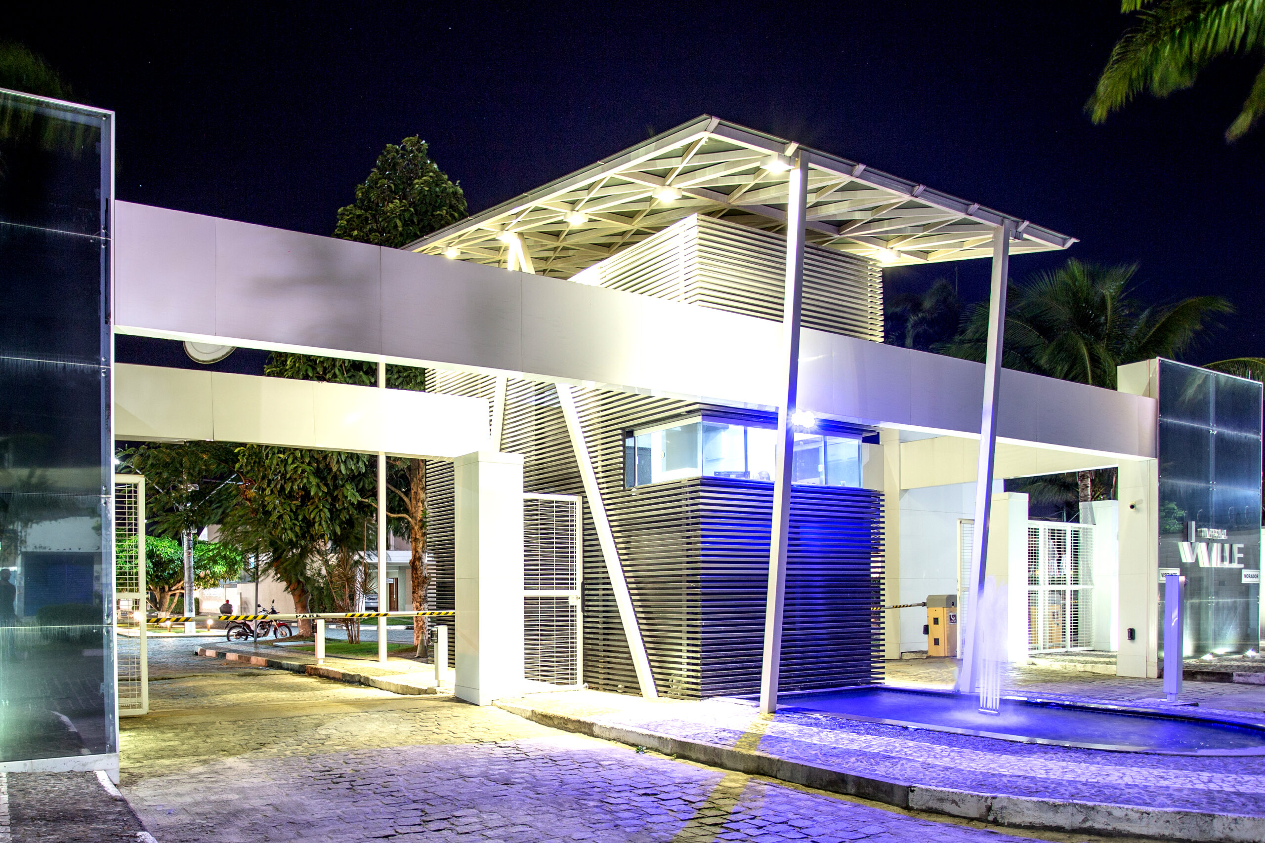 Com linhas marcantes e acabamento em tons claros, o projeto valoriza a arquitetura contemporânea, criando uma entrada imponente e acolhedora ao mesmo tempo. O ponto central é o elegante espelho d’água com fonte iluminada, que acrescenta sofisticação e cria um efeito visual único, principalmente durante a noite.